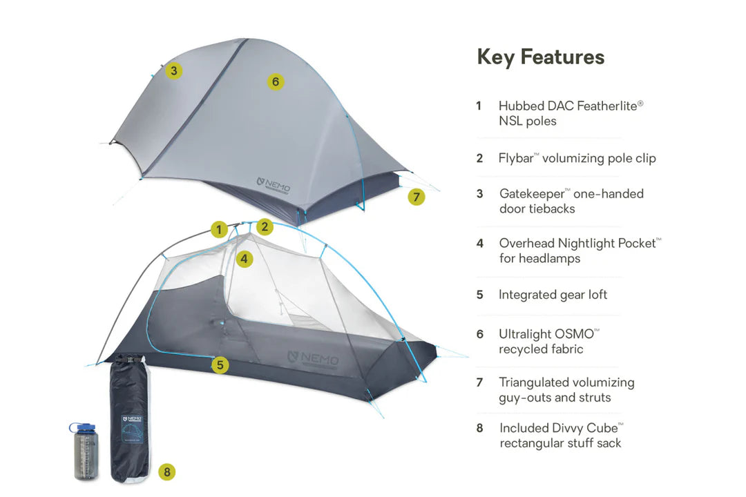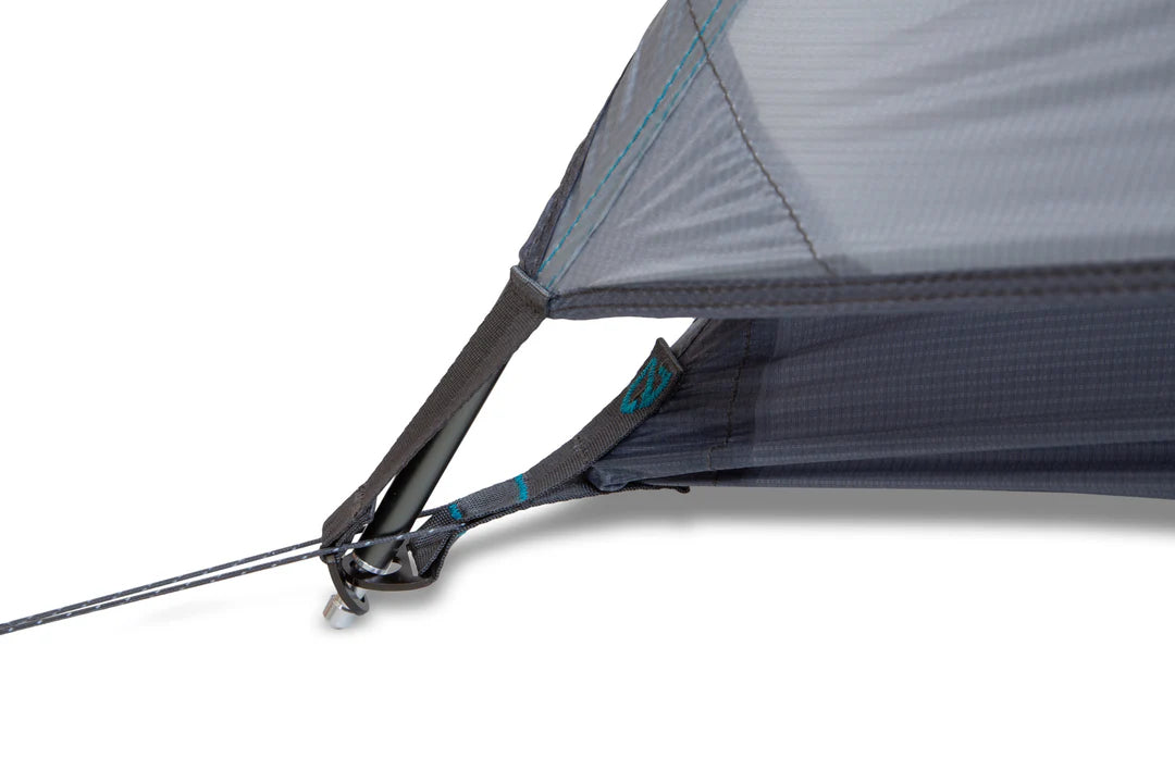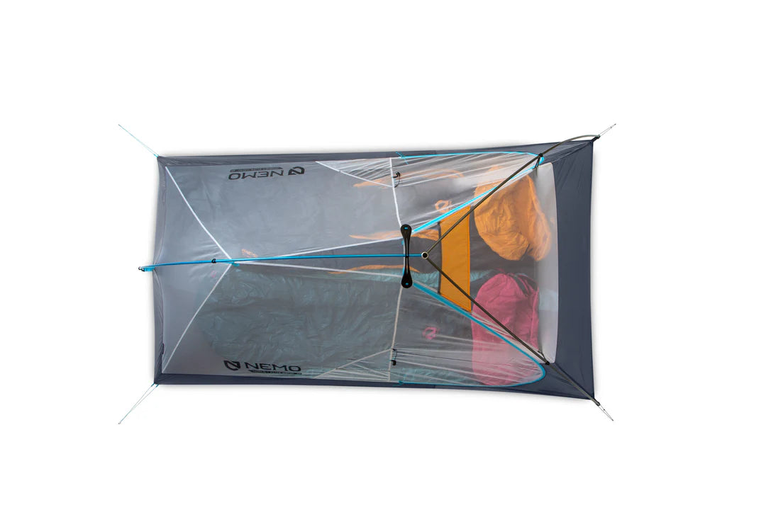 The Elite moniker means we’ve examined every detail of this tent for weight savings and performance enhancement. The poles are top-shelf DAC Featherlite. Every stitch, cord, and webbing detail are optimized for weight and strength. Our Nightlight Pocket™ headlamp diffuser adds a warm glow at night without the weight of built-in lighting. And our patent-pending Flybar™ volumizing pole clip brings headroom to the interior volume without adding unnecessary ounces. The Hornet Elite OSMO tent also features our convenient new Gatekeeper™ door tie-back and our Divvy Cube™ rectangular stuff sack that nests more efficiently in your pack and allows you to split the weight with a partner. By driving technology and design forward, NEMO’s Hornet Elite OSMO is a maximalist approach to minimalist design.