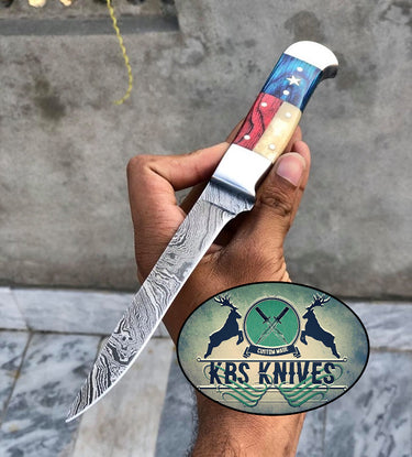 Show off your Texas pride with this handmade Damascus Steel Fillet-Boning Knife from KBS Knives Store. Designed for both function and style, it features a Texas Flag handle made from Exotic Wood and Bone with a sturdy Steel bolster. Measuring 11 inches overall, this knife delivers perfect balance, sharpness, and control for all your filleting and boning tasks.