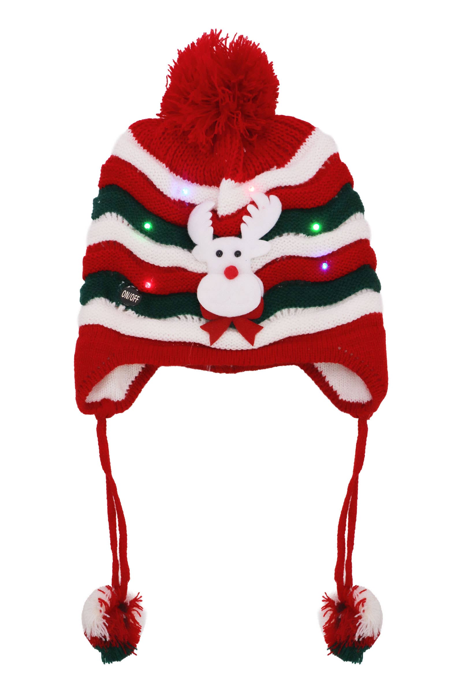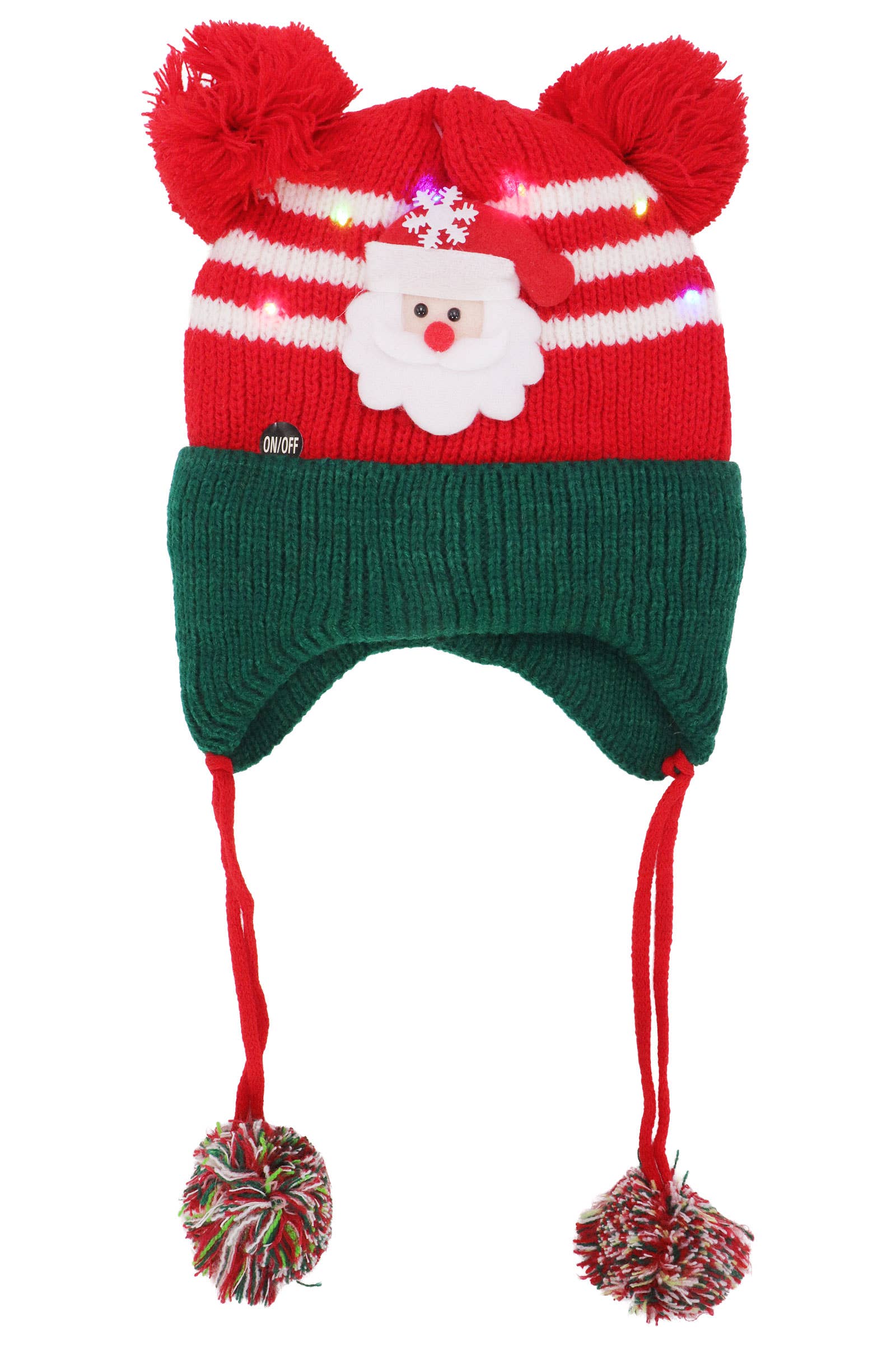 Kids Christmas LED Light-Up Knitted Ear Cover Chin Strap Fuzzy Faux Fur Pom Pom Sherpa Fleece Lined Cuffed Beanie