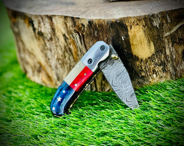 "Custom Handmade Texas Flag Damascus Steel Folding Pocket Knife | Exotic Wood-Bone Texas Flag Handle | 3.1 Inch Blade | Leather Sheath | KBS Knives Store"