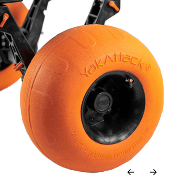 The TowNStow Sand Tire features an air-filled, balloon tire made from PVC, mounted on an injection molded two-piece wheel. The air-filled tires are optimized for various soft surfaces, including sand and mud, and yes, they are YakAttack Orange. The wheels are made from UV-resistant, high-quality, injection-molded polymers and assembled with stainless steel hardware. They feature sealed hubs to keep out sand and grit and are designed for use in harsh outdoor and marine environments. Like the BeadLoc hard surface wheels, the TowNStow Sand Tires are interchangeable with all YakAttack TowNStow kayak carts, and easily snap in place and are removed with a push of a button.