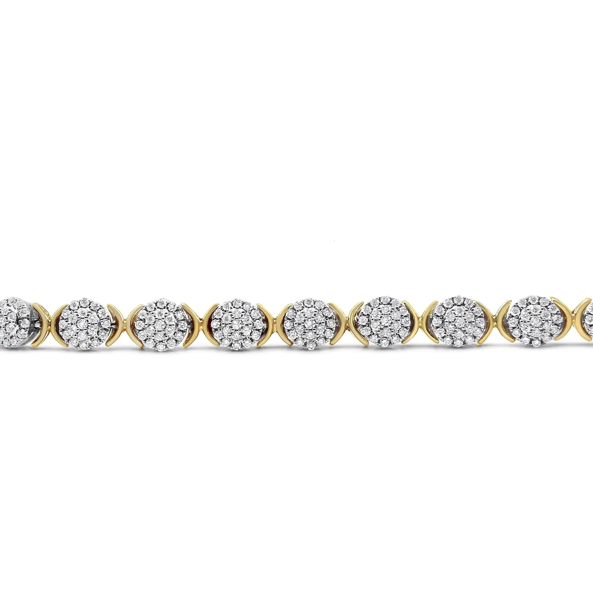 Dress her wrist with this dashing diamond fashion bracelet. Crafted in warm 10K Yellow Gold plated .925 Sterling Silver , this bracelet pairs polished "X" shaped links with circular frames set with shimmering lab grown, round diamonds, creating a look with elegance and rhythm. Each floral cluster contains 19 diamonds tightly set together to create the look of a big, single diamond. A lovely look any time, this bracelet captivates with 5 ct. t.w. of diamonds and a polished shine.