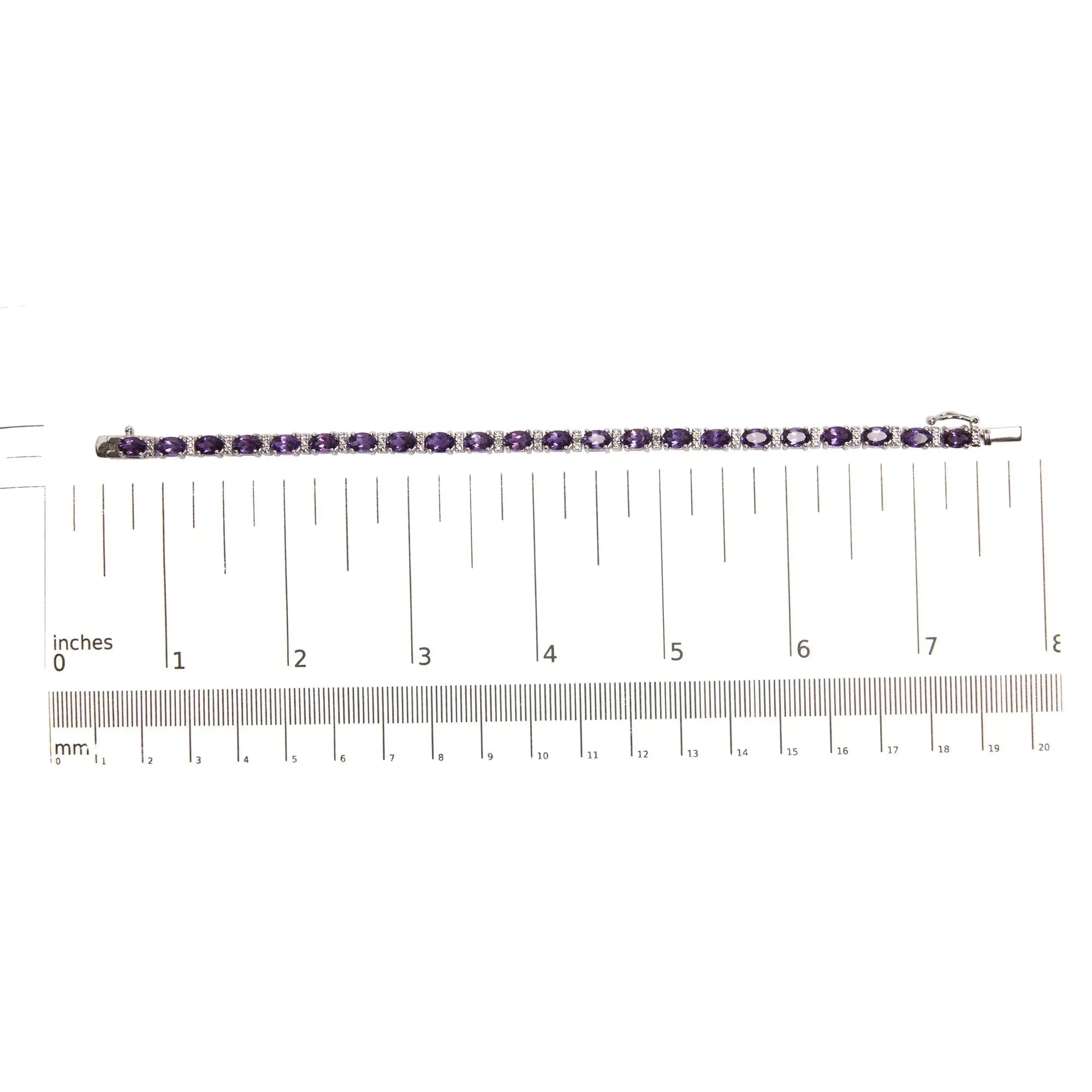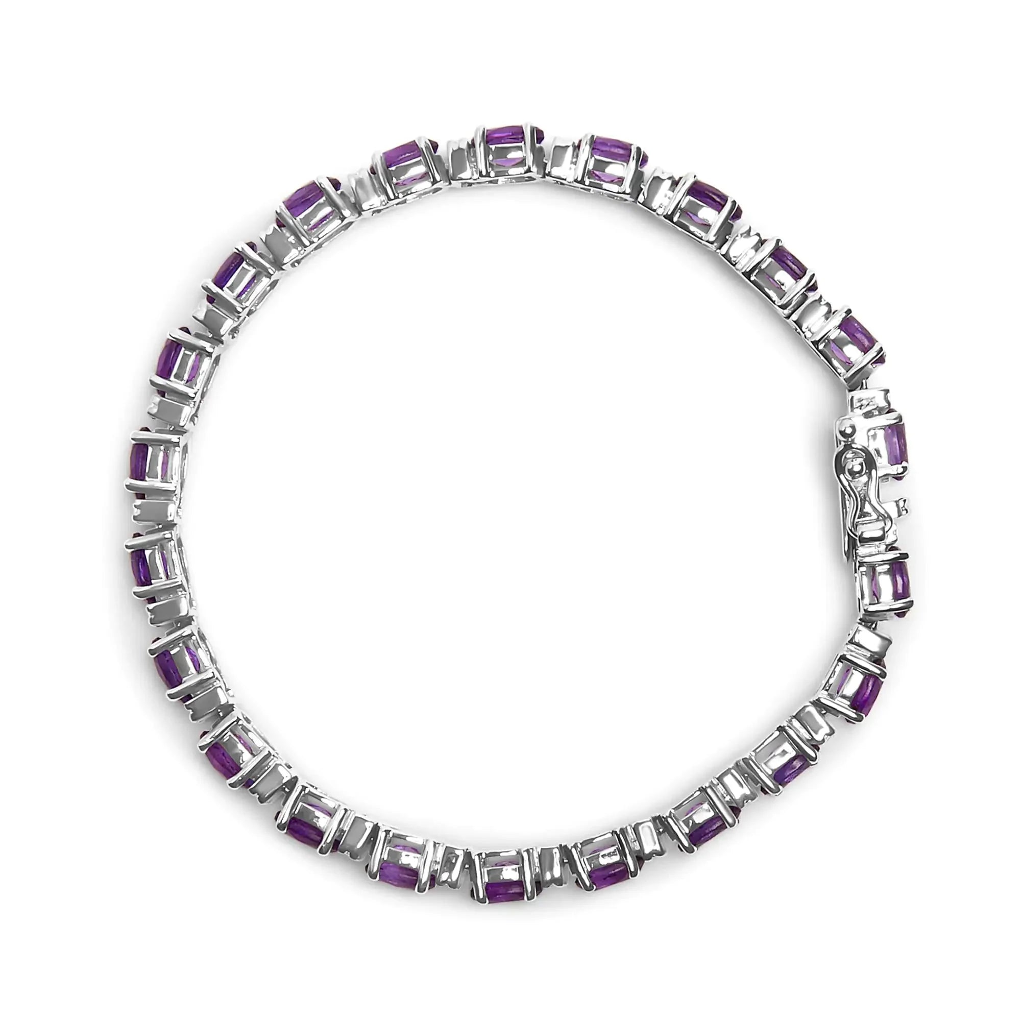 Indulge in the ethereal beauty of this .925 Sterling Silver Link Tennis Bracelet. Adorned with 10 dazzling round diamonds and 22 exquisite oval amethyst gemstones, this bracelet is a true masterpiece. The alternating purple amethyst and white diamond accents create a mesmerizing dance of colors, captivating all who lay eyes upon it. Crafted with care, the shared prong diamond setting ensures maximum brilliance and sparkle. The 9 1/2 cttw gemstone count guarantees a luxurious and opulent look. With a secure box clasp, this bracelet is designed to grace the wrist of a confident and elegant woman. Embrace the allure of this enchanting piece and let its timeless beauty elevate your style to new heights.