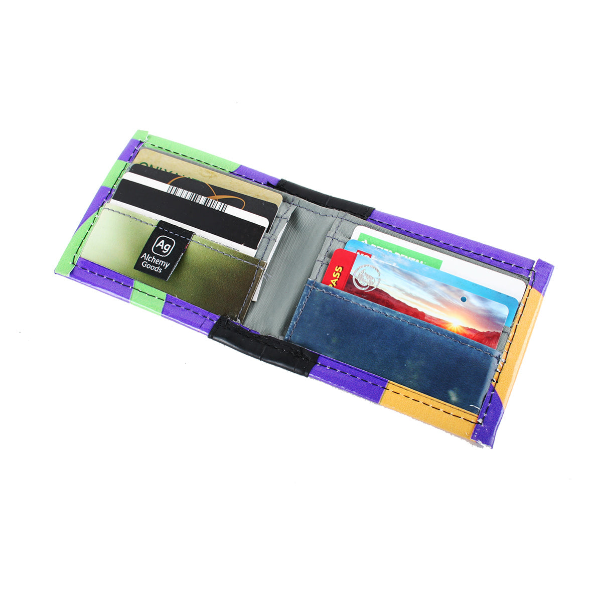 STYLISH WALLET WITH MULTIPLE POCKETS. The Bellevue Wallet is our new bifold wallet made out of upcycled advertising banners. The Bellevue features 6 internal pockets for organizing your credit cards and one bill/cash pocket.