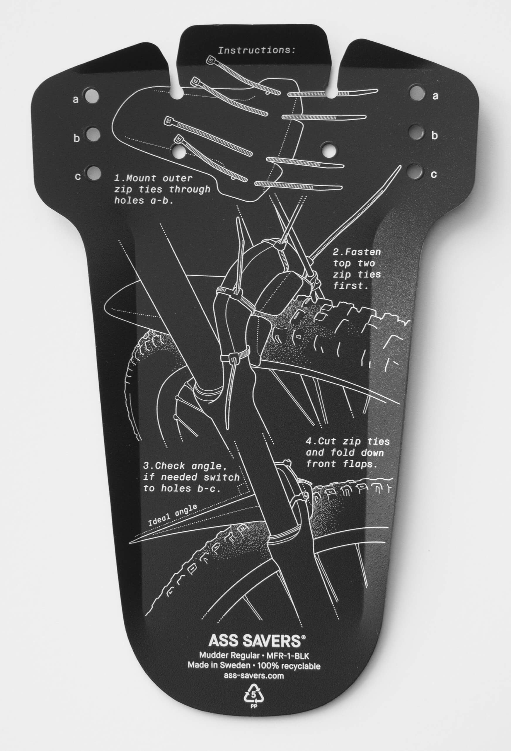 Ass Savers MUDDER is designed for use by bikers to protect their face from dirt sprays and mud splashes during high speed trail rides. The MUDDER attaches with zip ties to guarantee an instant and perfect fit on all fork sizes.