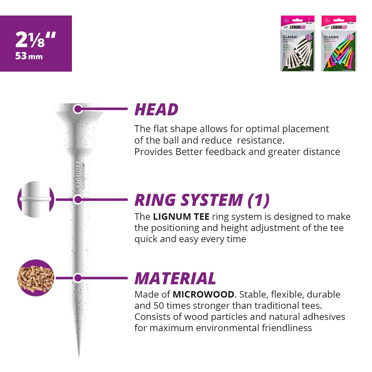 FLEXIBLE, DURABLE & STURDY: Lignum's microwood construction is 50x more durable than traditional tees, offering the benefits of durability and stability so that golfers can keep using them for a long time. Lignum's construction uses the right amount of polymer fiber for flexibility that increases speed of the ball significantly compared to traditional wood or plastic tees.