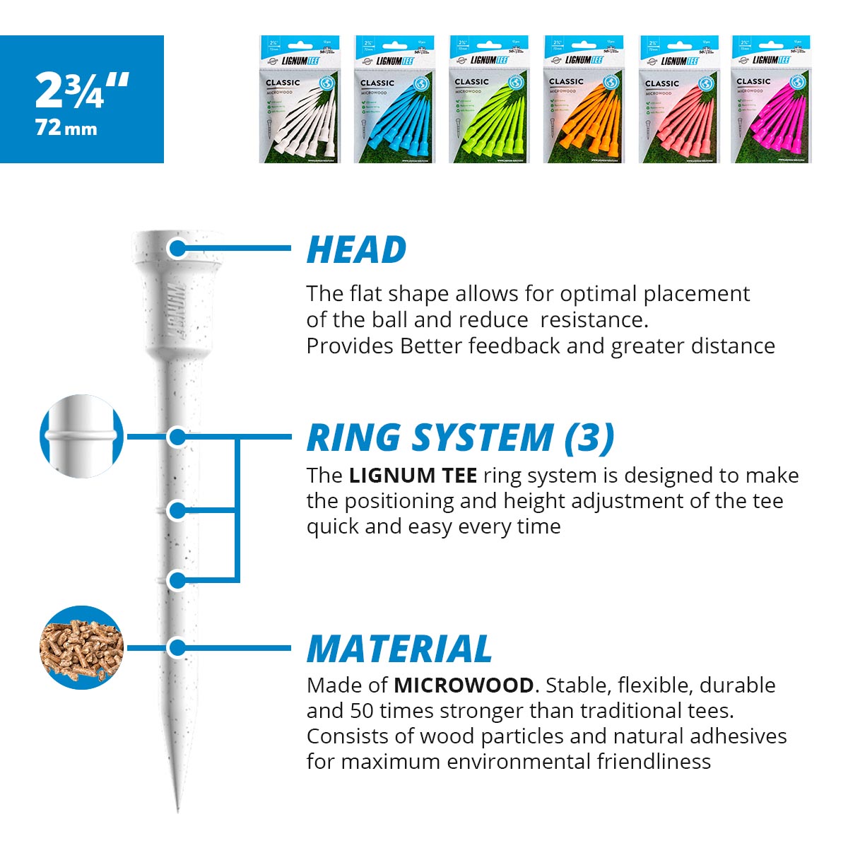 Lignum Tees are manufactured in Europe and is recommended by over 5 Million golfers for consistent tee height for a better game. Their smooth and soft profiling ensures comfort as well as no damage to any material that is used in turf maintenance.