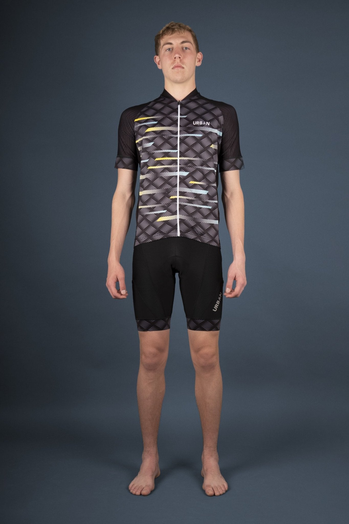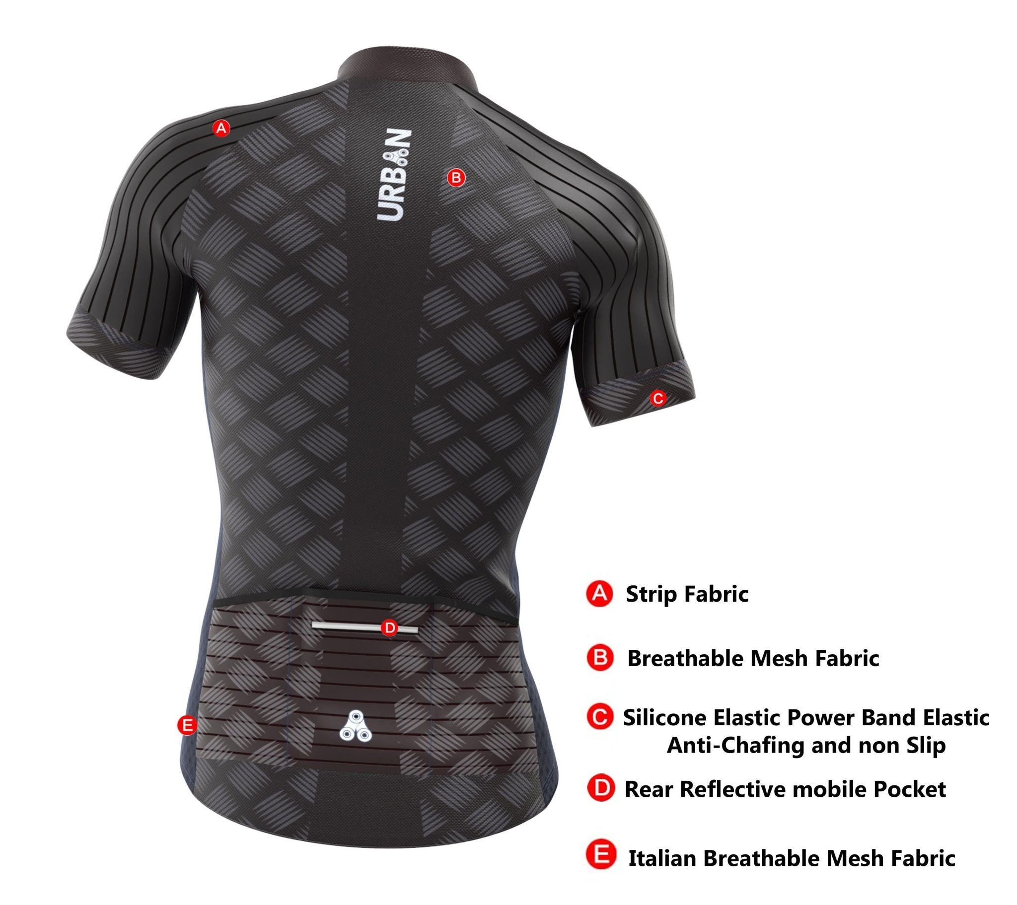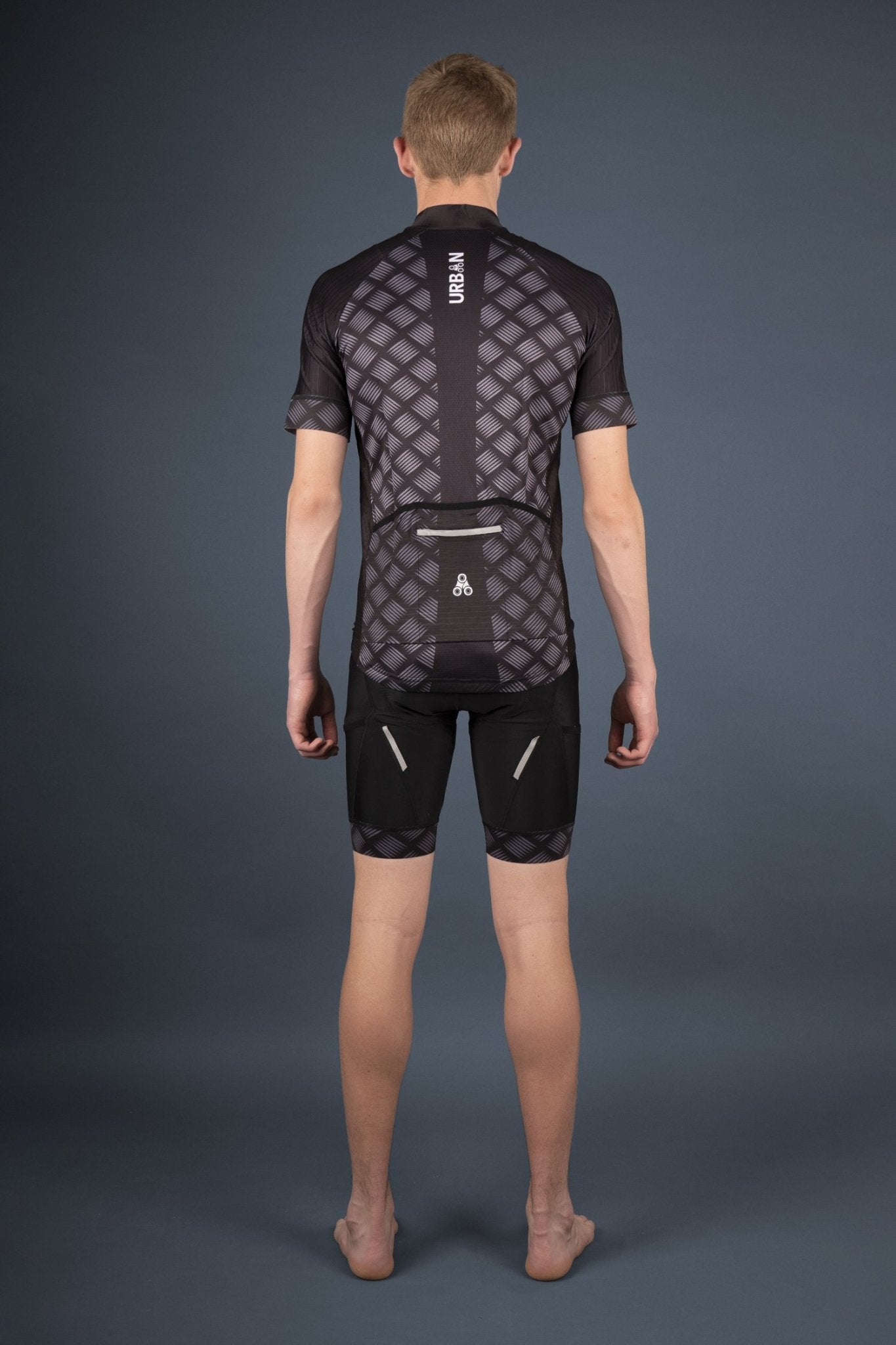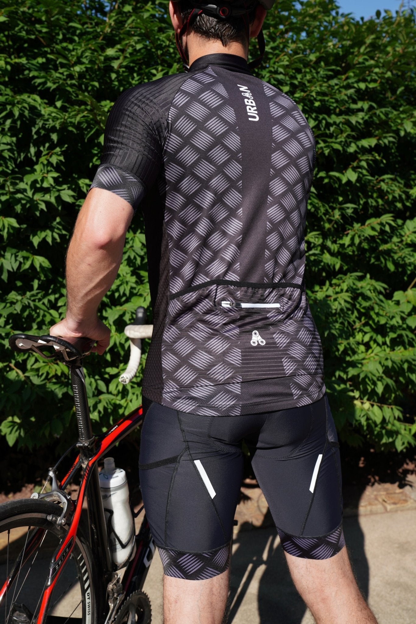 Designed in the U.S.A. for our pro athletes seeking comfort and performance. Our engineers obsess over anatomic fit, aerodynamics, safety, and fabric innovation so you can focus on your ride. These lightweight and breathable jerseys and bib shorts keep you feeling comfortable and dry. The Urban printed elastic grippers hold the jersey and short edges in place and from riding up. The longer shaped back is well suited for cycling riding position. The Jersey is a full length zipper with 3 rear pockets plus an extra zipped pocket for your valuables. Reflectors on both the back and thighs were added for dusk and night riding. BONUS: These bib shorts have a mobile phone pocket!