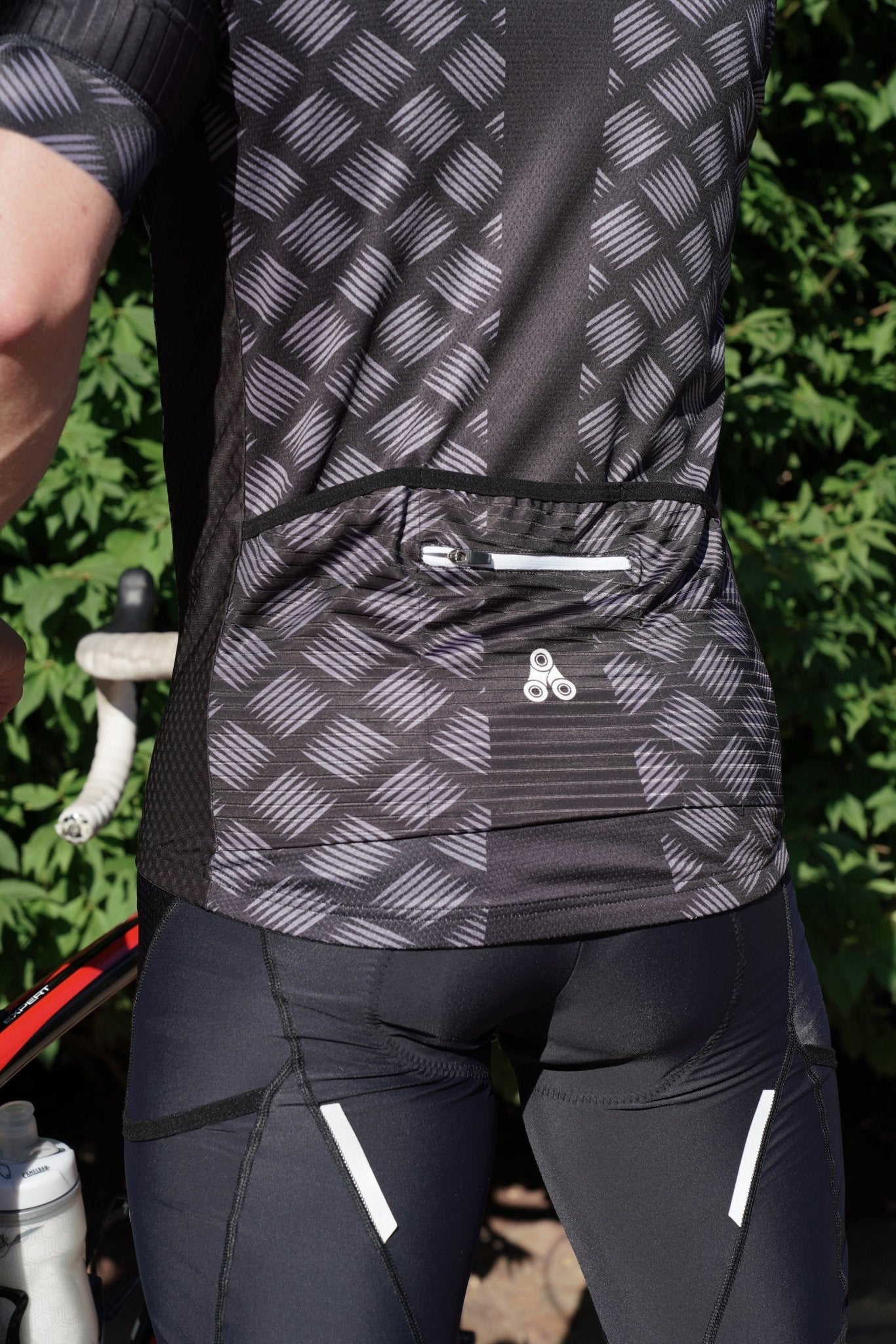 - Full length zip, three back pockets for storing small items, plus THIGH phone pockets on bib shorts.