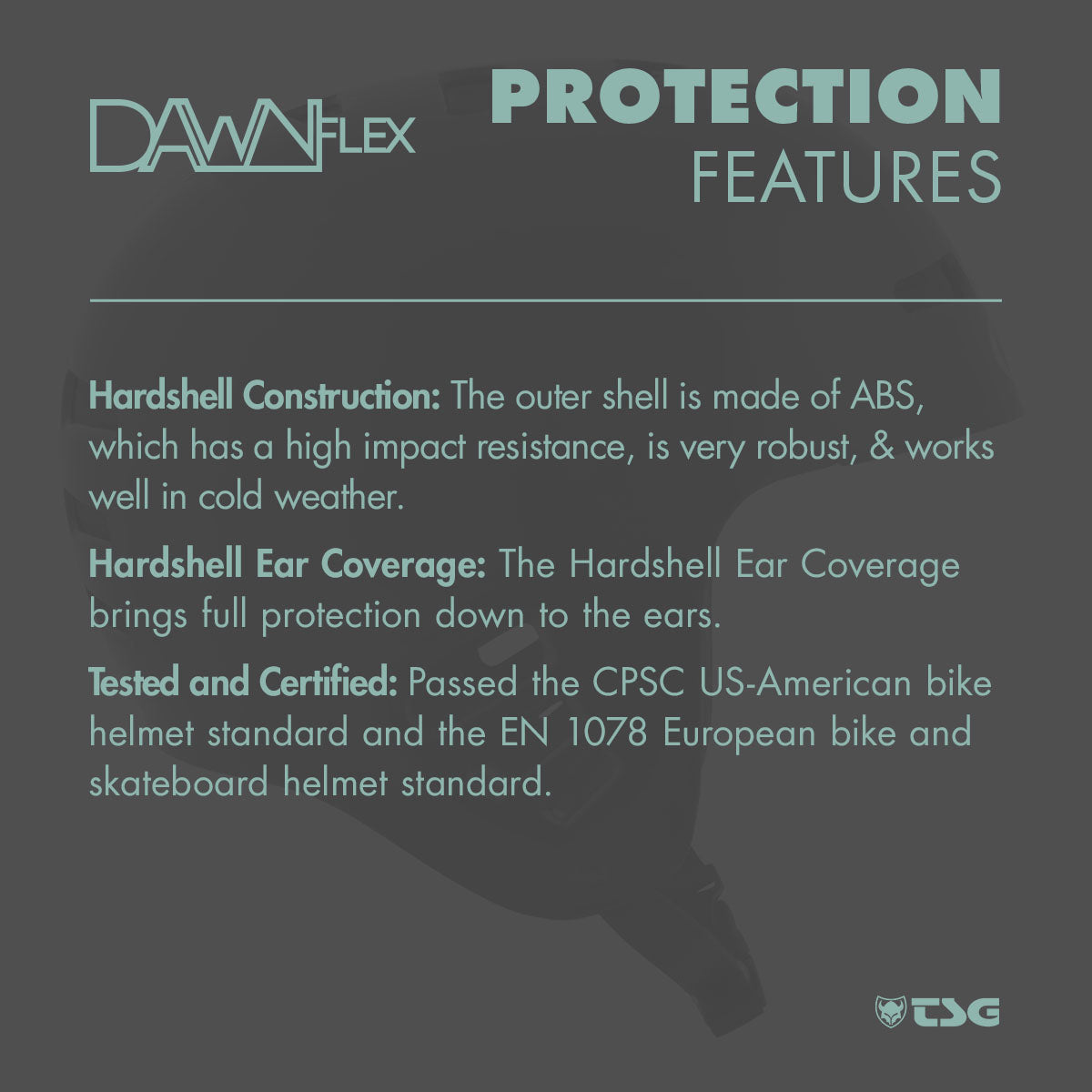 Worry stops with Dawn Flex helmets, with the guaranteed quality that is regulated by international safety standards such as CE EN 1078 (European standard for bike and skateboarding helmets) and CPSC (US-American standard for bike helmets). Designed in Switzerland, all TSG products are tested by an internal team of passionate riders.