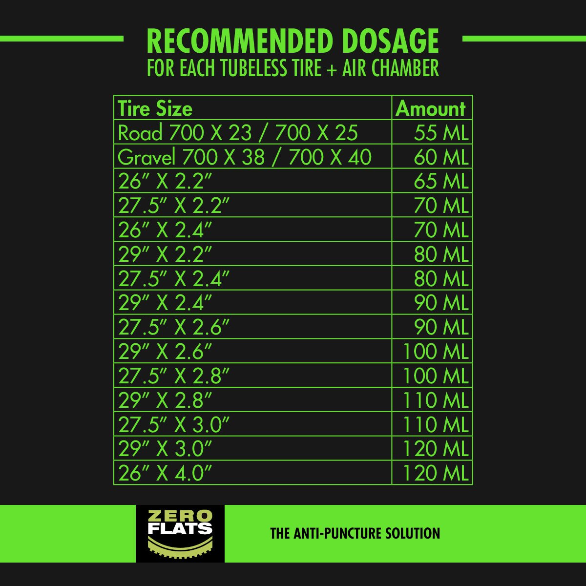 - DOSAGE: For two tires - FAT or 29". For more information, please look at our picture chart. Other bottle / size options are also available.